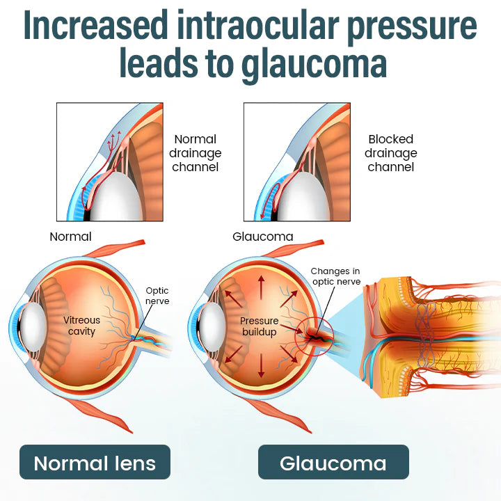 Glaucoma: Excessive eye pressure compresses the optic nerve, gradually narrowing the visual field — if untreated, it can cause permanent blindness.